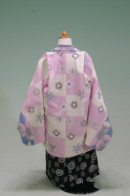 三歳女児の祝着としては、肩上げをした着物に帯を結ばず被布(ヒフ)という袖無しの上着を羽織るのが一般的です。
